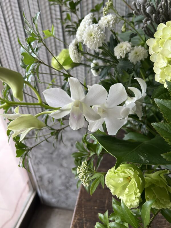 他、アセビ、木苺、白藤袴、トルコ桔梗、紫陽花、スプレーマム、竜胆、デンファレ、シルバーブロニアです。